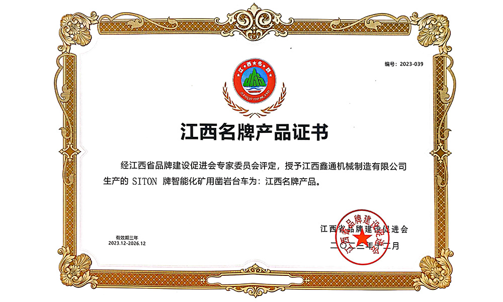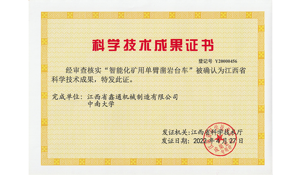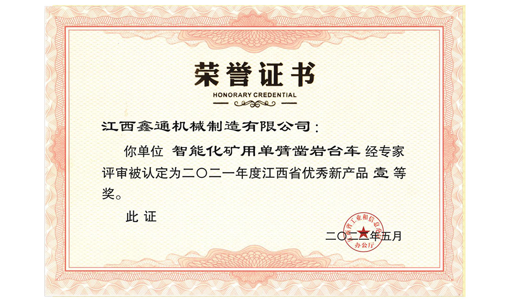 智能化礦用單臂鑿巖臺(tái)車(chē)榮譽(yù)證書(shū)